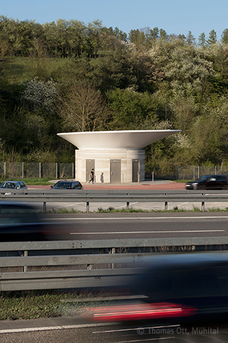 Das äußere Erscheinungsbild ist geprägt durch eine aufgesetzte und beleuchtete Membran. Dieses zeichenhafte Dach sorgt für gute Auffindbarkeit, Schutz und allseitige Ausleuchtung zur Nachtzeit. Hierfür wurden spezielle, umweltfreundliche LEDs mit 3.000 K (Lichtfarbe) eingesetzt, welche nachweislich deutlich weniger Insekten anlocken.