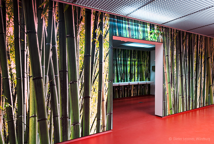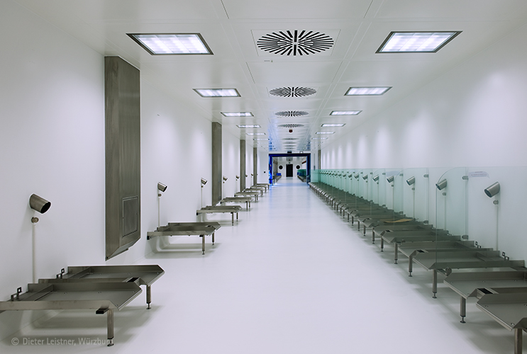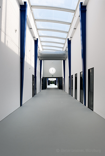 Die Haltung und Materialität nimmt Bezug auf das bestehende Werk und setzt diese sinnfällig fort. Die Primärstruktur aero-blau, Wandflächen Gebäudehülle weiss und aluminiumfarben, Bodenbeschichtungen nach definierten Hygienestandards farbig.
