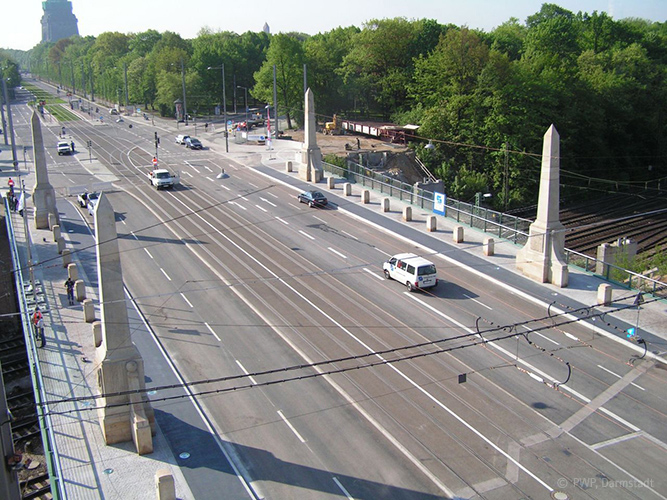Die denkmalgeschützten Sandsteinobelisken behielten ihre Symbolwirkung auf der Brücke. Entwurfsentscheidend war die Stellung der Obelisken, welche wiederum im Stadtraum wirksam sein sollten. Zu diesem Zweck wurden sie eingerückt, zwischen Rad- und Gehweg neu aufgebaut und in ihren historischen Zustand konservatorisch belassen (lediglich gereinigt und mit einem matten farbneutralen Graffitischutz überzogen). Eine transparente Geländerkonstruktion unterstreicht die Schlankheit des Überbaus und ist ein Verweis auf den zeitgemäßen Neubau der Brücke.