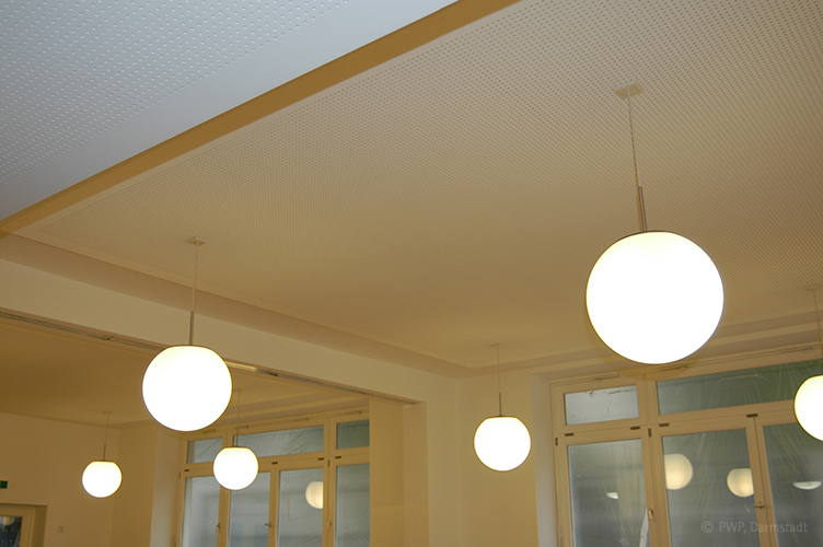 Besonders hervorzuheben sind die Gruppen- und Gemeinschaftsräume, in denen Schall absorbierende Deckenfelder die Raumakustik verbessern. Alle Oberflächen wurden teilweise bis auf das Mauerwerk frei gelegt und erneuert, Bodenbeläge wurden teilweise neu verlegt und in den Nebenräumen wurden alle Verfliesungen erneuert.