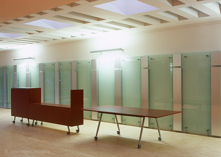 Die Neuinterpretation und Konversion betraf insbesondere auch die Materialien, mit denen neue Räume, die alte, vorhandene Geometrie des Gebäudes neu verpackt worden sind. Kirschholzfurnier an den Wänden des großen Saals lässt die Zugänge zu Lager- oder Küchenräumen nun unsichtbar verschwinden und das gleichzeitig auf zeichenhafter Ebene ein ganzes lokales Thema aufgreift: die Streuobstwiesen überall in der Region. Oder die hinterleuchteten Glasflächen aus sogenanntem precrashed-Glas, effektvoll, nicht effekthascherisch und für potentielle Vandalisten – auch daran muss in einem öffentlichen Gebäude gedacht werden – alleine dadurch uninteressant, dass die mittlere der drei Glasschichten bereits in tausende Splitter zerbrochen ist. Ausgesucht ist auch der Bodenbelag der neu geschaffenen Funktionsräume im mehrgeschossigen Bühnentrakt: „Pillarguri“, ein robuster Quarzschiefer aus Norwegen, dem fossile Einschlüsse eine warme Struktur verleihen.