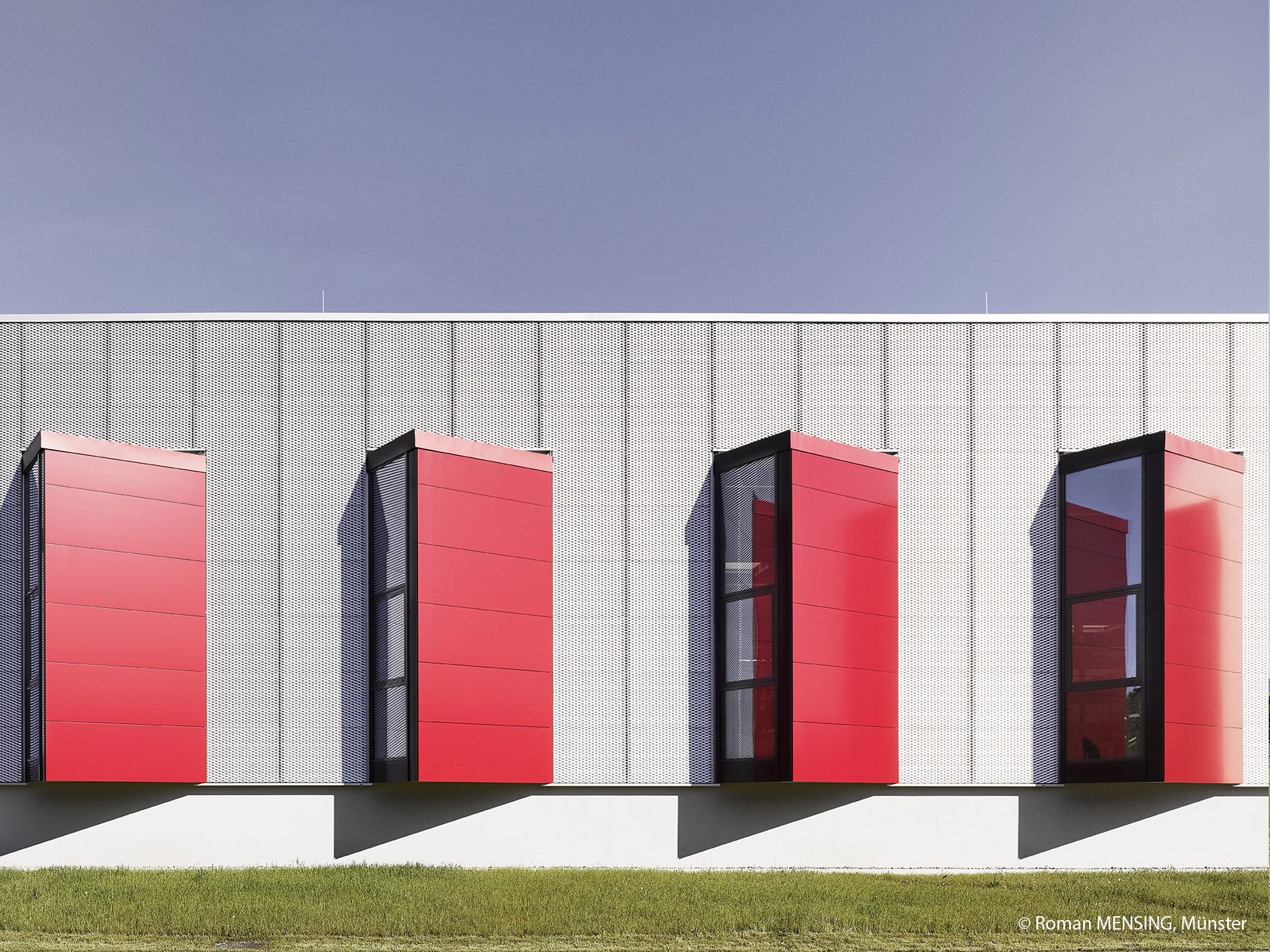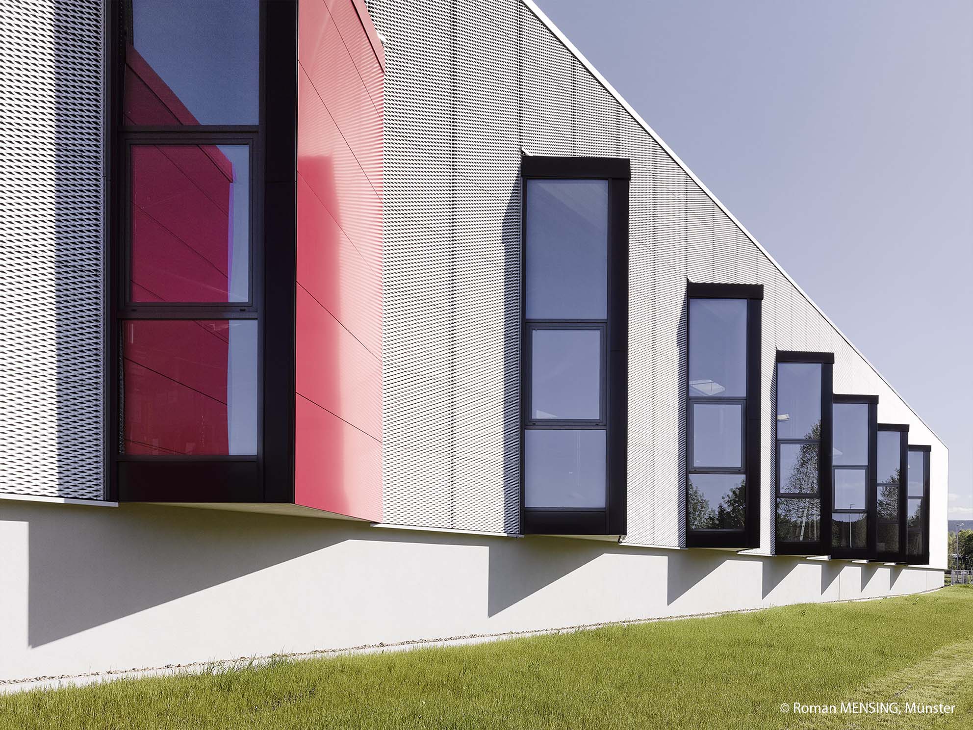 Die architektonische Konzeption sieht vor, dass ein Verbindungsbau die Klammer zwischen der bestehenden, architektonisch wertvollen Shed-Halle des Bestandes und dem Neubau auf gleicher Höhenlage der Hallenböden bildet. Hier wird der Anschluss sowohl für den Materialfluss von Halle zu Halle, als auch für die interne fußläufige Verbindung der Mitarbeiter über den zentralen Flur des Büroriegels im Erdgeschoss geschaffen.