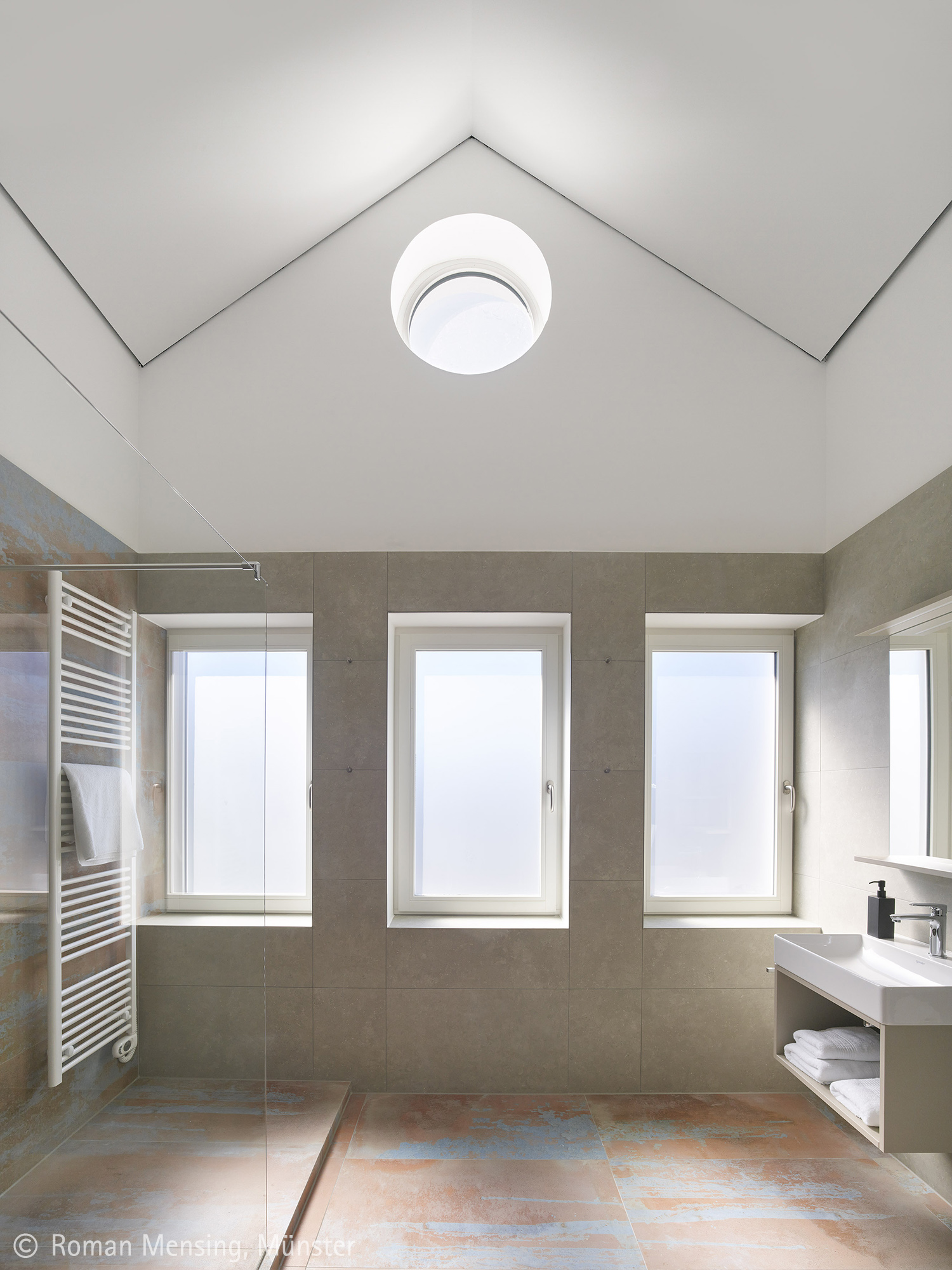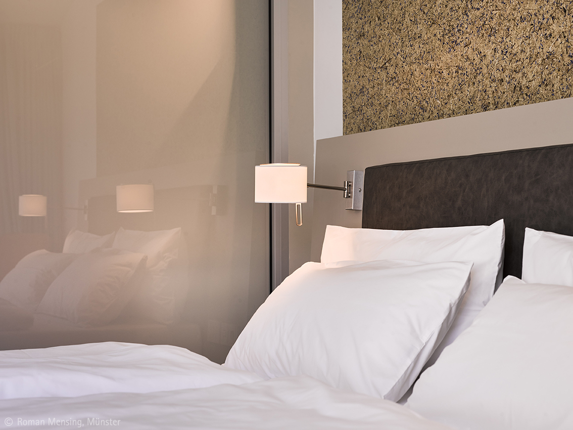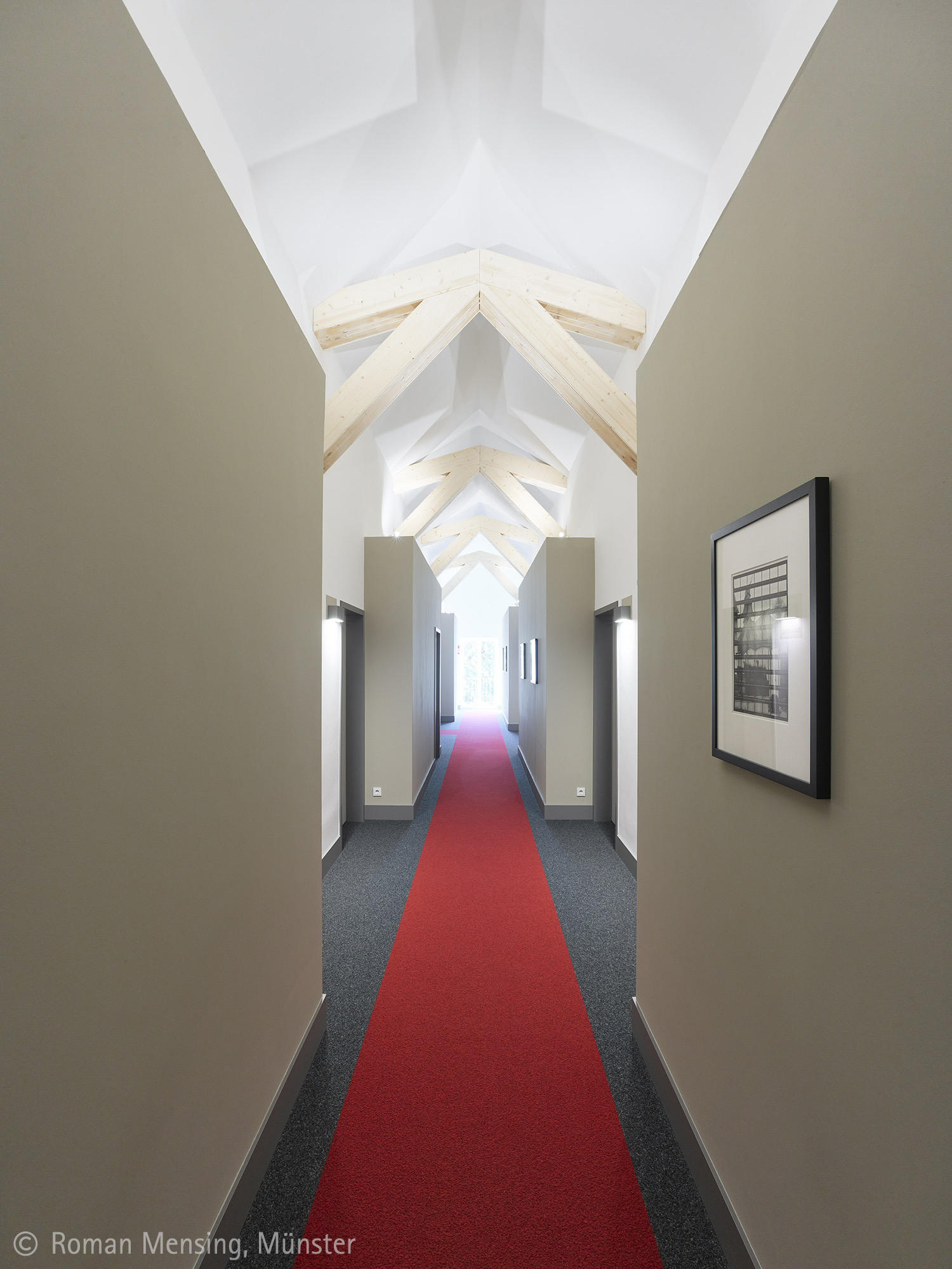 Über den Sälen, in dem neu aufgebauten Dachstuhl, ist ein kleines Hotel mit 10 Zimmern und 2 Suiten entstanden, deren Gestaltung eine lässig-elegante Modernität ausstrahlt.