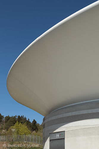 Das äußere Erscheinungsbild ist geprägt durch eine aufgesetzte und beleuchtete Membran. Dieses zeichenhafte Dach sorgt für gute Auffindbarkeit, Schutz und allseitige Ausleuchtung zur Nachtzeit. Hierfür wurden spezielle, umweltfreundliche LEDs mit 3.000 K (Lichtfarbe) eingesetzt, welche nachweislich deutlich weniger Insekten anlocken.