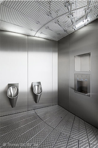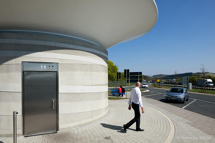 In Diskussion mit Hessen mobil, Straßenmeistereien vor Ort und Fachplanern, wurde eine kompakte Form entwickelt mit vier Unisexkabinen, separatem Behinderten-WC und zwei Urinalen. Herzstück ist ein zentraler Technikraum, welcher alle Anlagen rückwärtig versorgt. Neuere Erkenntnisse führten zu einem völligen Verzicht auf herkömmliche Materialien wie Fliesen und sonstigen Bekleidungen. Alle Oberflächen sind reversibel, werden regelmäßig gereinigt und gespült (z.B. Bodenspülung unter dem Doppelboden).