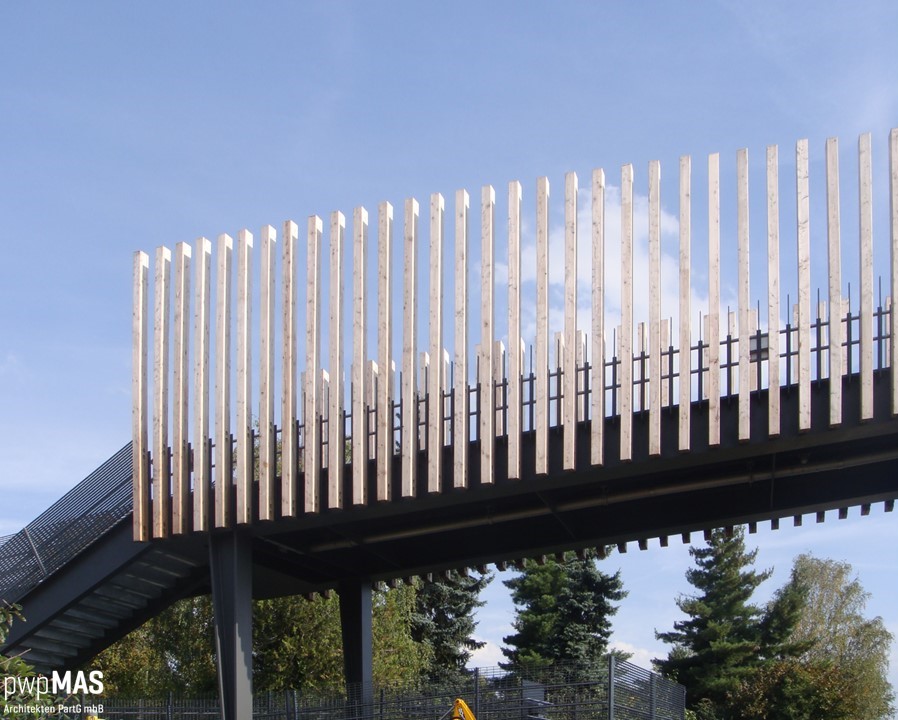 Die Fußgängerüberführung über die S-Bahn und B 6 besteht aus einem leicht geschwungenen Stahlüberbau, welcher harmonisch das südliche und nördliche Fußwegenetz anbindet. Die Abgänge sind als behindertengerechte Rampen gestaltet. Darüber hinaus besteht für die direkte Wegeverbindungen jeweils ein Treppenabgang.