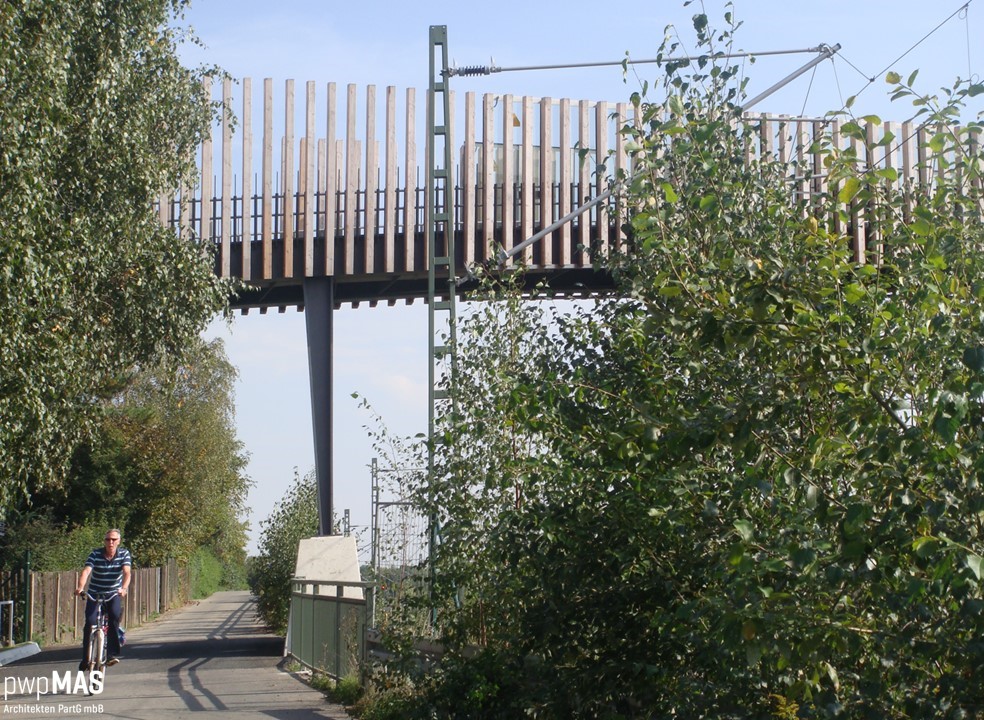 Die seitliche Geländeabstützung erfolgt mittels Gabionen. Der behindertengerechte Anschluss erfolgt über gepflasterte - alternativ asphaltierte - Wegeflächen mit Entwässerung. Je eine bestehende Zuwegung zu Drittgrundstücken an der nördlichen und südlichen Seite wurde berücksichtigt. Darüber hinaus wird an der nördlichen Seite eine bestehende Wegeverbindung parallel zum Rampenbauwerk in wassergebundener Decke wieder hergestellt.