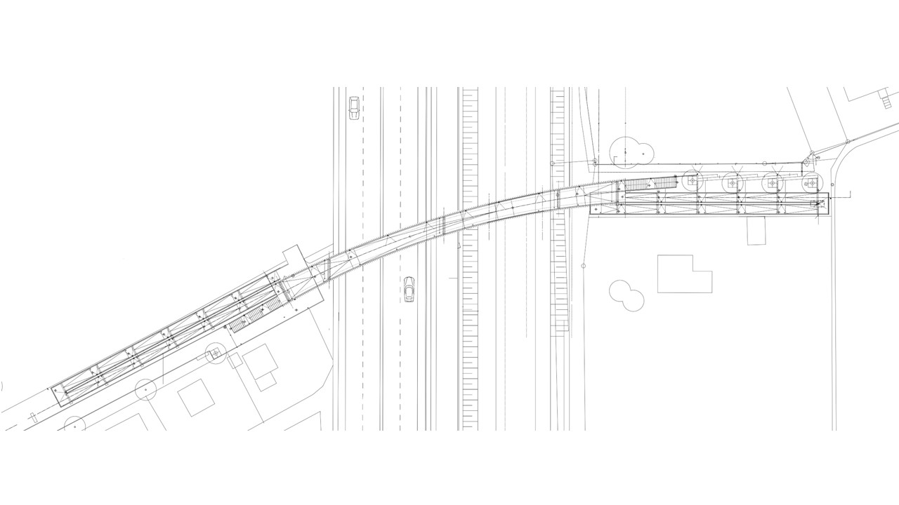 Auf Grund der beengten Verhältnisse und der erforderlichen Abwicklungslänge der Rampen sind diese gegenläufig und teilweise übereinander angeordnet. Die Rampen bestehen aus Teilstücken mit 6,00 m Länge bei 6 % Gefälle und Zwischenpodesten von 1,50 m Länge, wodurch sich ein Gesamtgefälle des tragenden Stahlquerschnitts von 4,8 % ergibt.