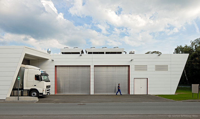 Umriss sowie die innere Gliederung aus dem Bestand wurde aufgenommen, und straßenseitig die Hülle polygonal aufgelöst, was zu einem markanten Auftritt jenseits gängiger Hallenstrukturen führte.