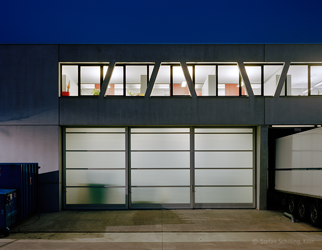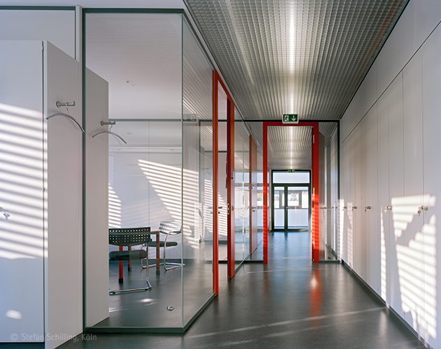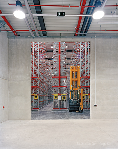 Sozialräume und Technikflächen ordnen sich peripher des beschriebenen Rückgrates an. Der Bedarf an zusätzlichen Büroflächen im Bereich Logistik, wurde durch die Überbauung der Überladebrücken im 1. OG gedeckt: eine einbündige Bürospange -mit Blick auf die Anlieferungszone- gibt dem Warenein- und -ausgang ein charakteristisches Erscheinungsbild.