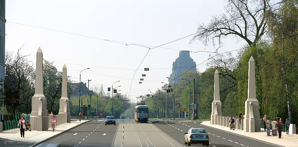 Die denkmalgeschützten Sandsteinobelisken behielten ihre Symbolwirkung auf der Brücke. Entwurfsentscheidend war die Stellung der Obelisken, welche wiederum im Stadtraum wirksam sein sollten. Zu diesem Zweck wurden sie eingerückt, zwischen Rad- und Gehweg neu aufgebaut und in ihren historischen Zustand konservatorisch belassen (lediglich gereinigt und mit einem matten farbneutralen Graffitischutz überzogen). Eine transparente Geländerkonstruktion unterstreicht die Schlankheit des Überbaus und ist ein Verweis auf den zeitgemäßen Neubau der Brücke.