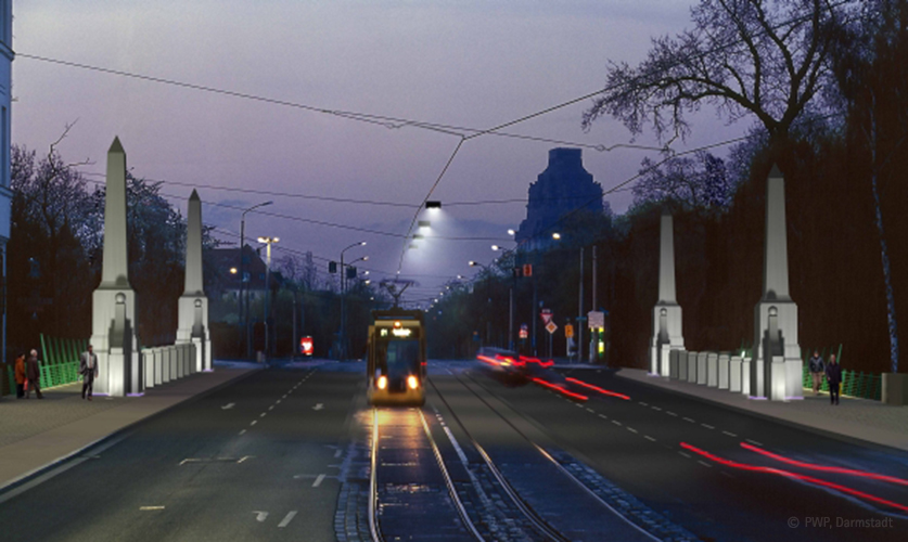 Neben der funktional erforderlichen Beleuchtung der Brücke als Verkehrsraum sieht das Lichtkonzept eine atmosphärische Ausleuchtung der Gehwegbereiche und eine Akzentuierung der historischen Aufbauten vor.