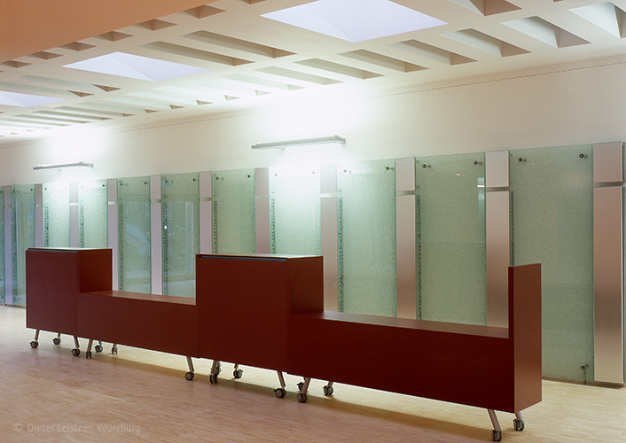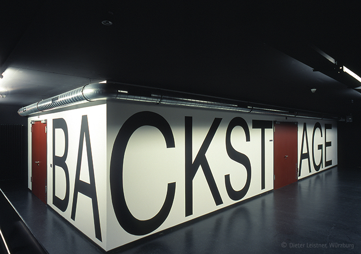 Die Neuinterpretation und Konversion betraf insbesondere auch die Materialien, mit denen neue Räume, die alte, vorhandene Geometrie des Gebäudes neu verpackt worden sind. Kirschholzfurnier an den Wänden des großen Saals lässt die Zugänge zu Lager- oder Küchenräumen nun unsichtbar verschwinden und das gleichzeitig auf zeichenhafter Ebene ein ganzes lokales Thema aufgreift: die Streuobstwiesen überall in der Region. Oder die hinterleuchteten Glasflächen aus sogenanntem precrashed-Glas, effektvoll, nicht effekthascherisch und für potentielle Vandalisten – auch daran muss in einem öffentlichen Gebäude gedacht werden – alleine dadurch uninteressant, dass die mittlere der drei Glasschichten bereits in tausende Splitter zerbrochen ist. Ausgesucht ist auch der Bodenbelag der neu geschaffenen Funktionsräume im mehrgeschossigen Bühnentrakt: „Pillarguri“, ein robuster Quarzschiefer aus Norwegen, dem fossile Einschlüsse eine warme Struktur verleihen.