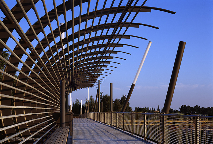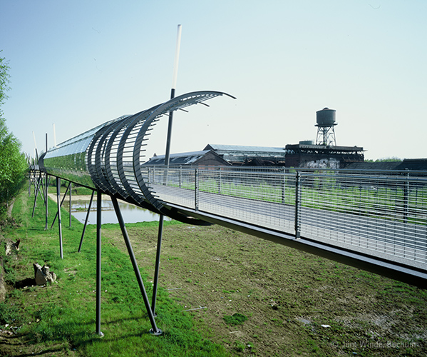 Im Rahmen der Umgestaltung und Nachnutzung des ehemaligen Industrieareals 'Bochum Innenstadt-West' mit Traditionsfirmen wie dem Bochumer Verein, wurde im Zuge der IBA-Emscher Park von PWP eine 220m lange Stegbrücke errichtet, welche wesentlicher Bestandteil eines Rundweges (Erschließung des neuangelegten Westparkes - rund um die Jahrhunderthalle) wurde.