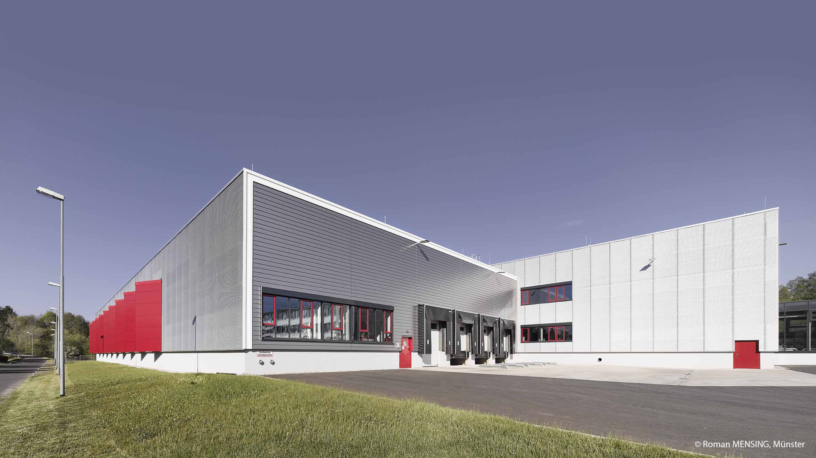 Die architektonische Konzeption sieht vor, dass ein Verbindungsbau die Klammer zwischen der bestehenden, architektonisch wertvollen Shed-Halle des Bestandes und dem Neubau auf gleicher Höhenlage der Hallenböden bildet. Hier wird der Anschluss sowohl für den Materialfluss von Halle zu Halle, als auch für die interne fußläufige Verbindung der Mitarbeiter über den zentralen Flur des Büroriegels im Erdgeschoss geschaffen.