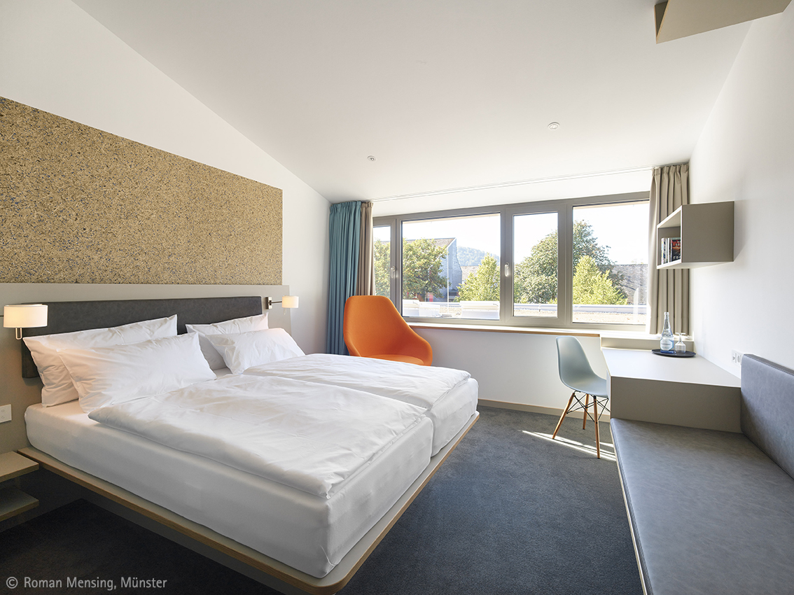 Über den Sälen, in dem neu aufgebauten Dachstuhl, ist ein kleines Hotel mit 10 Zimmern und 2 Suiten entstanden, deren Gestaltung eine lässig-elegante Modernität ausstrahlt.